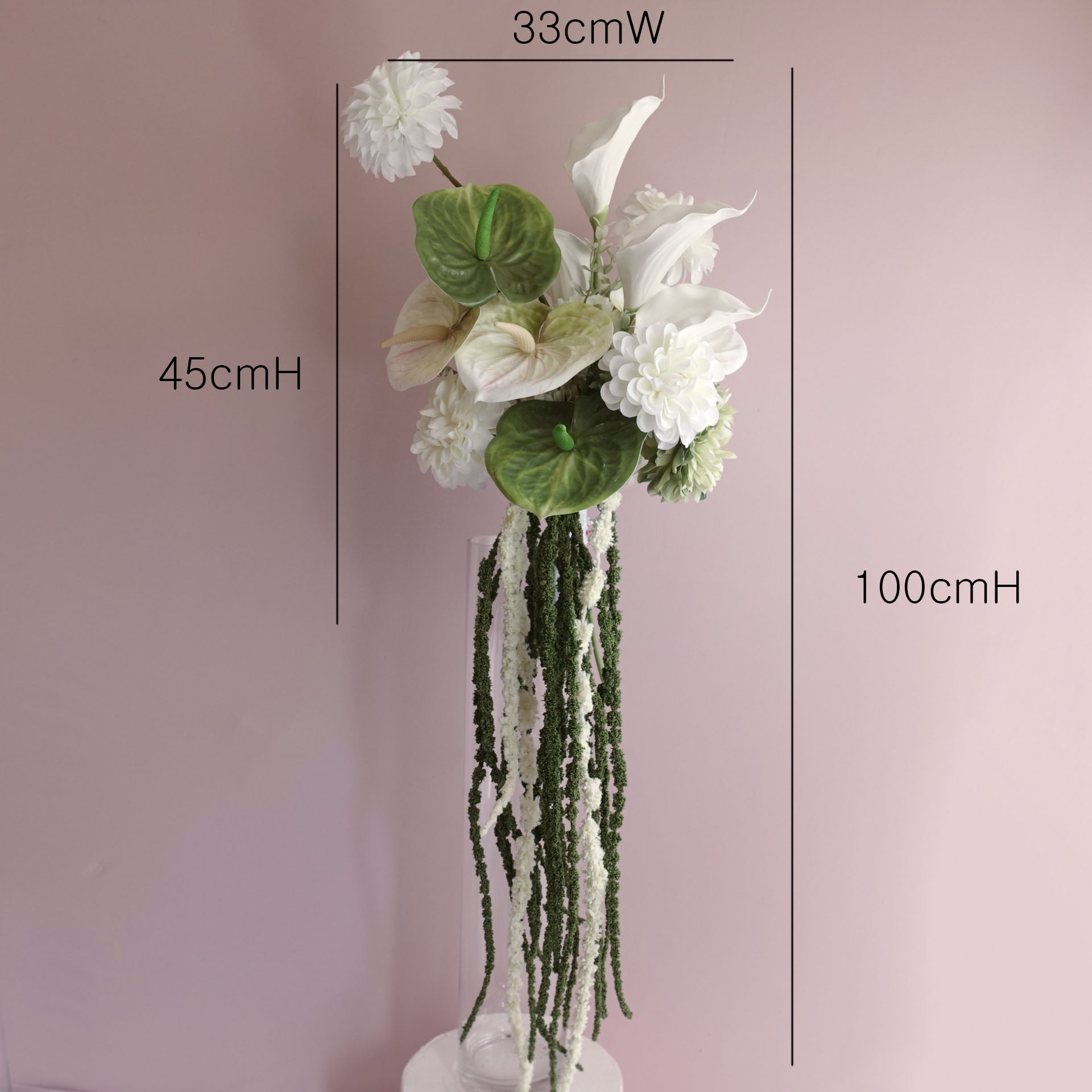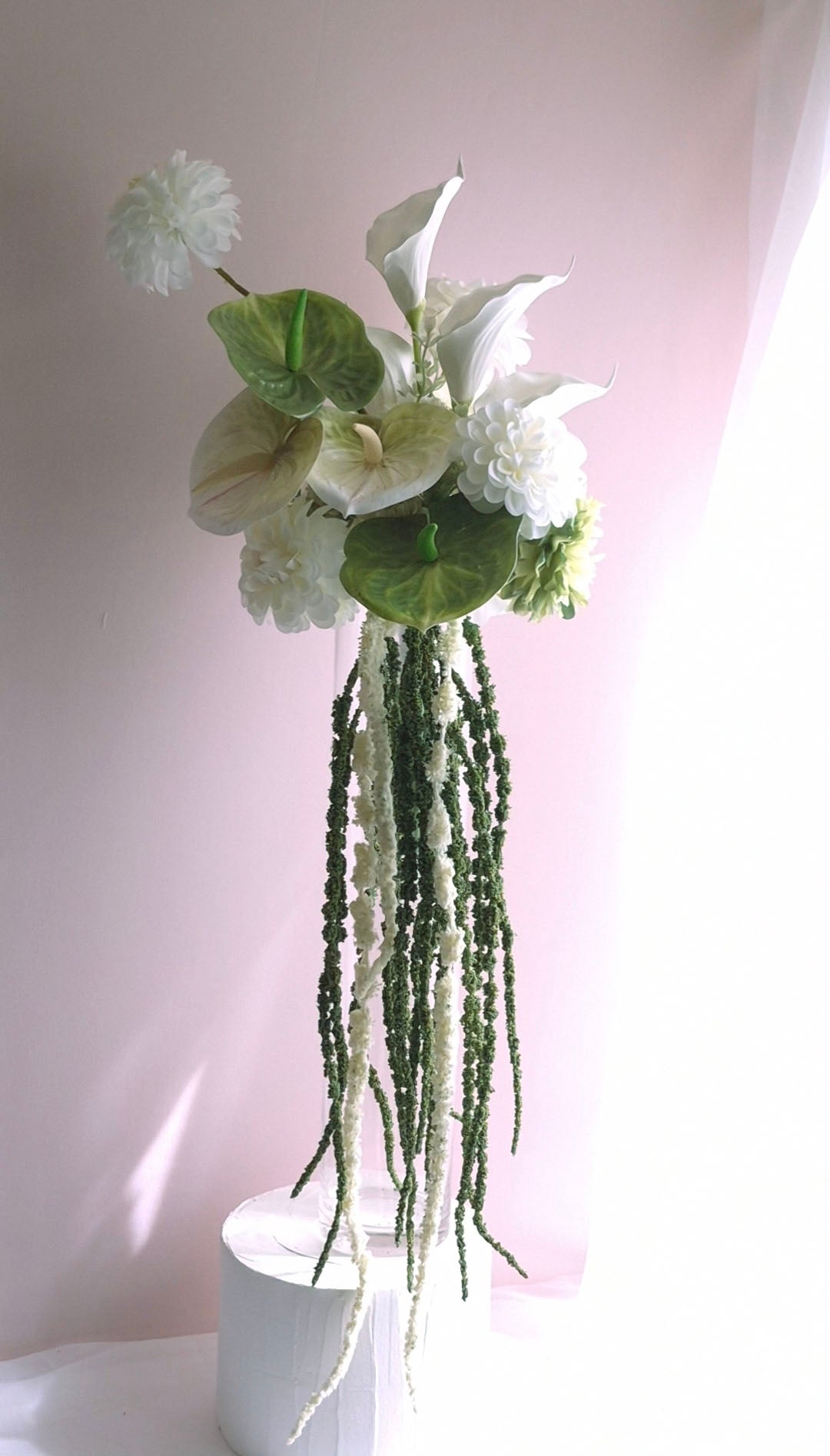 - Size: Bridal Bouquet: 33cmW x 45cmH (100cmH including Amarnthus drape) / Boutonniere: 8cmW x 17cmH