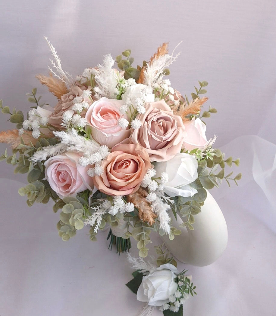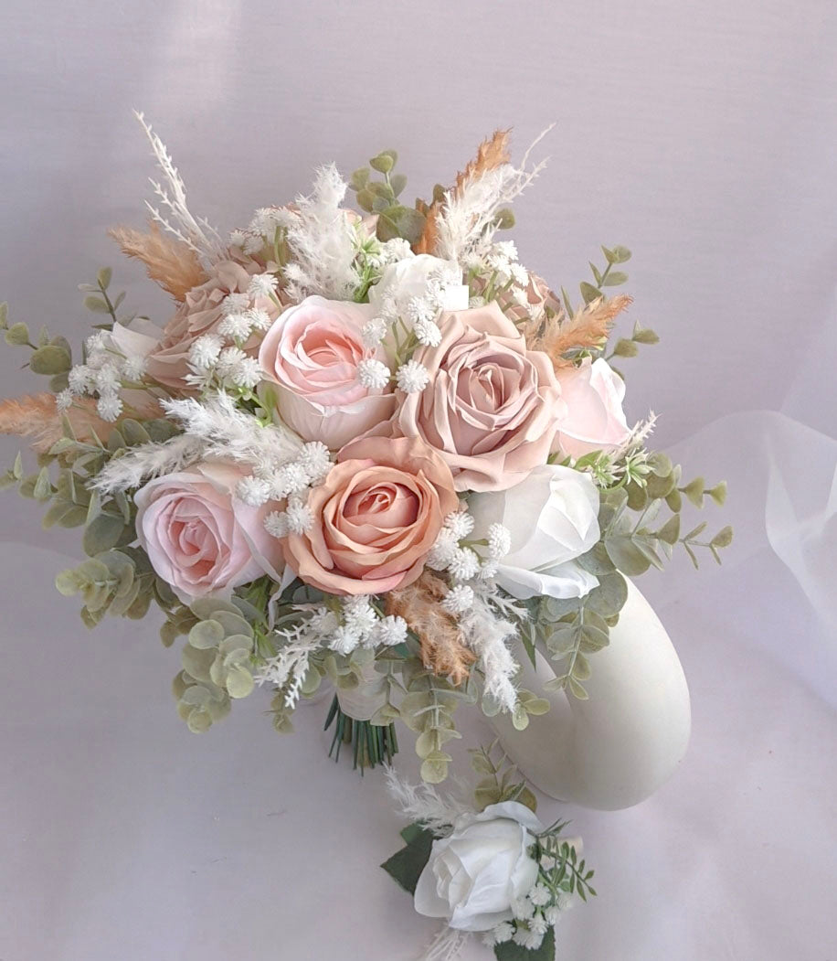 - Product & Type: Artificial Wedding Bouquet / Blush Brown White Rose Pampas Bouquet