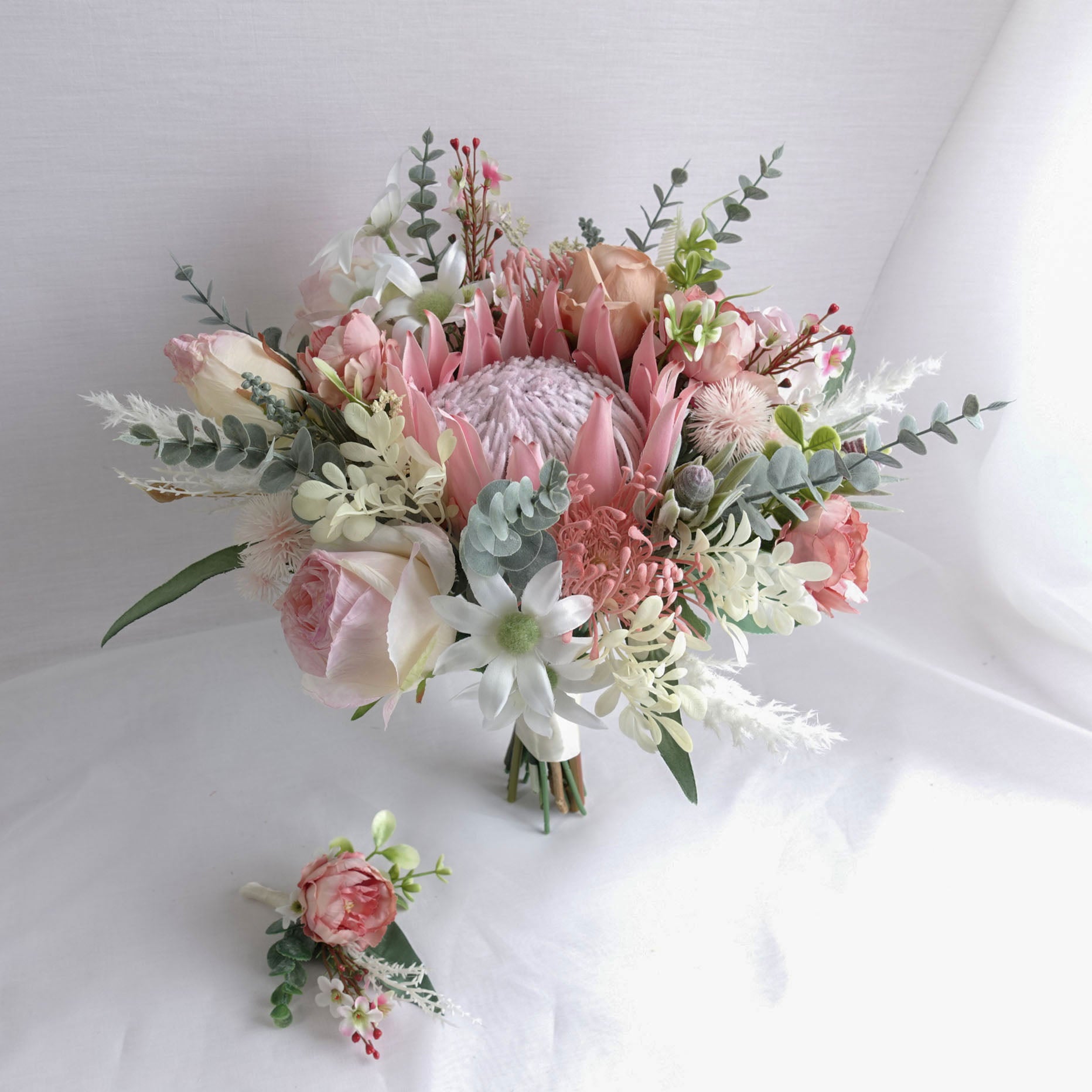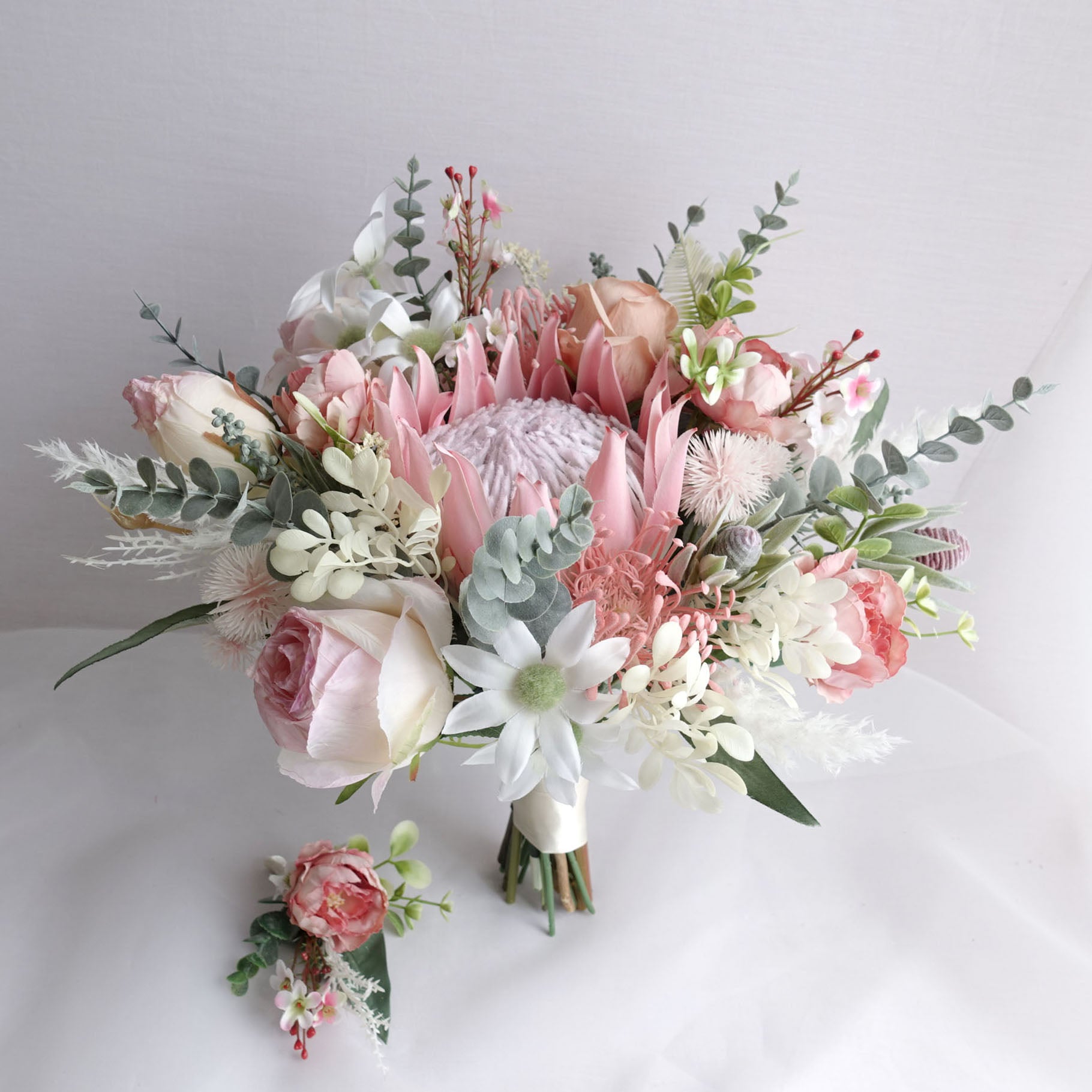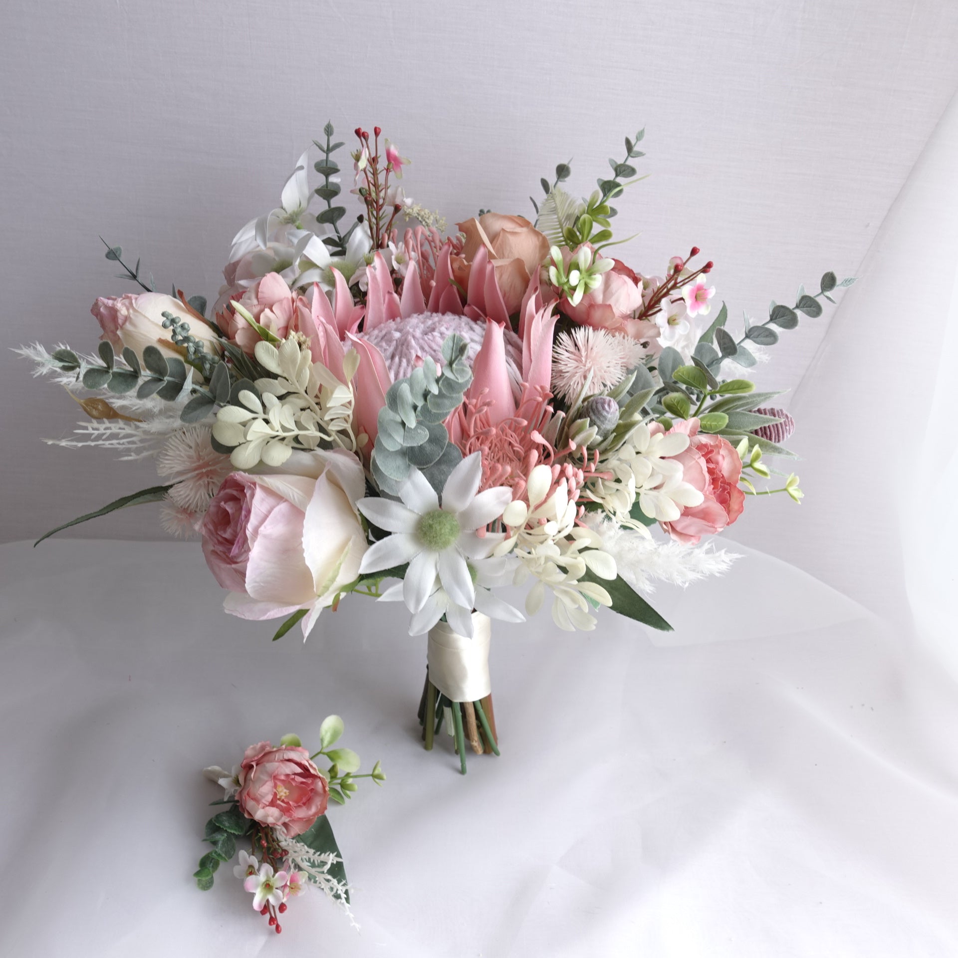 - Product & Type: Artificial Wedding Bouquet / Blush Pink King Protea Native Bouquet