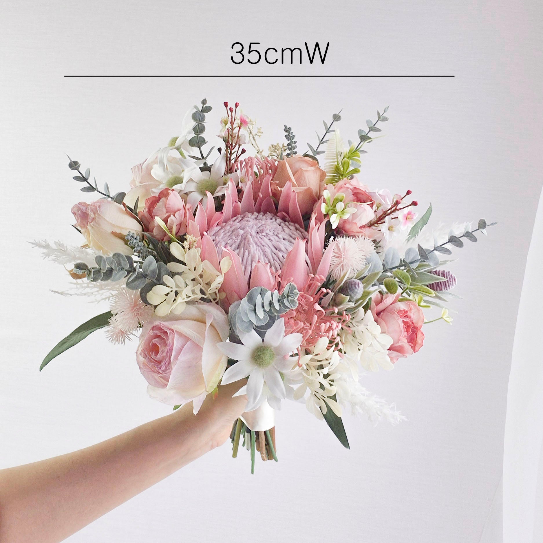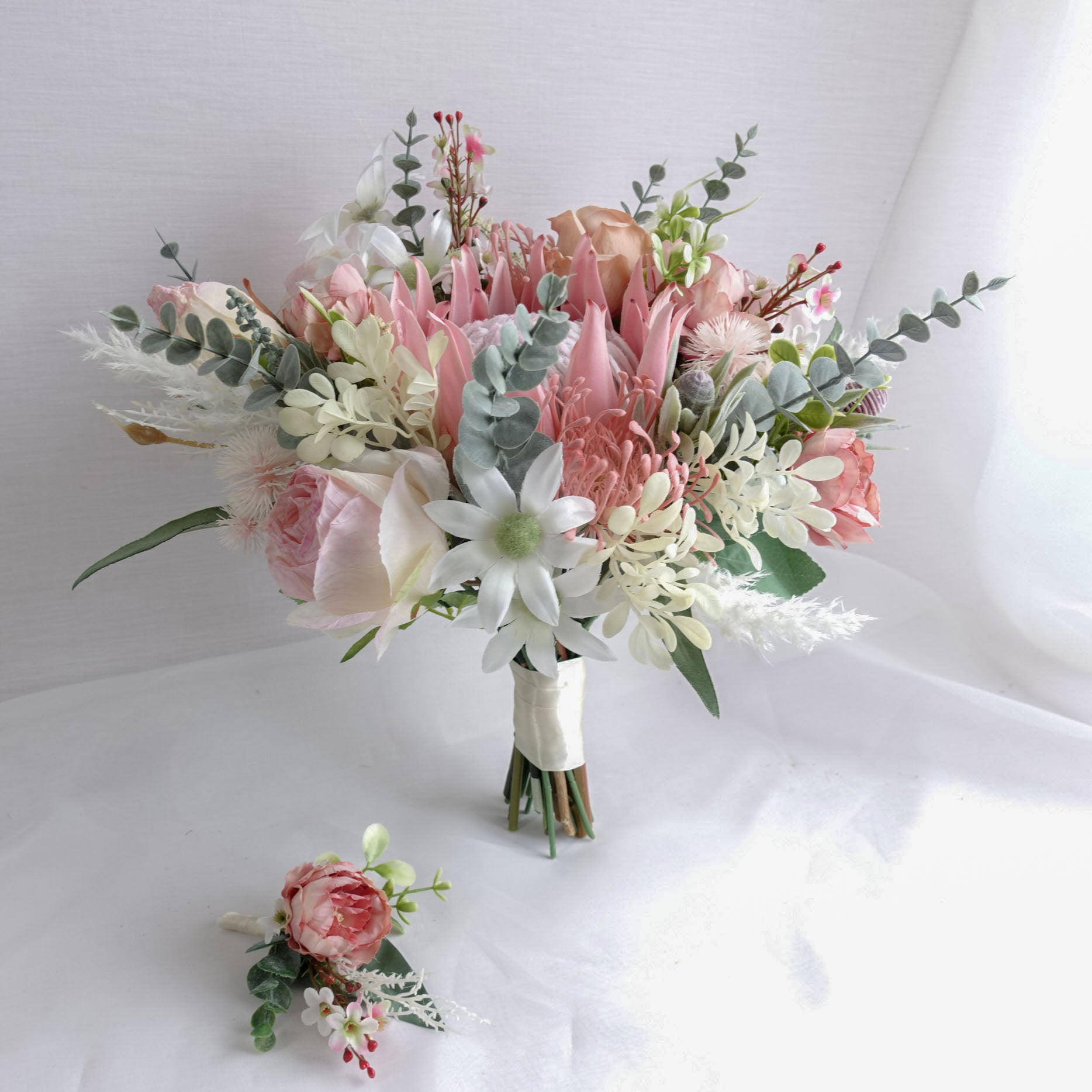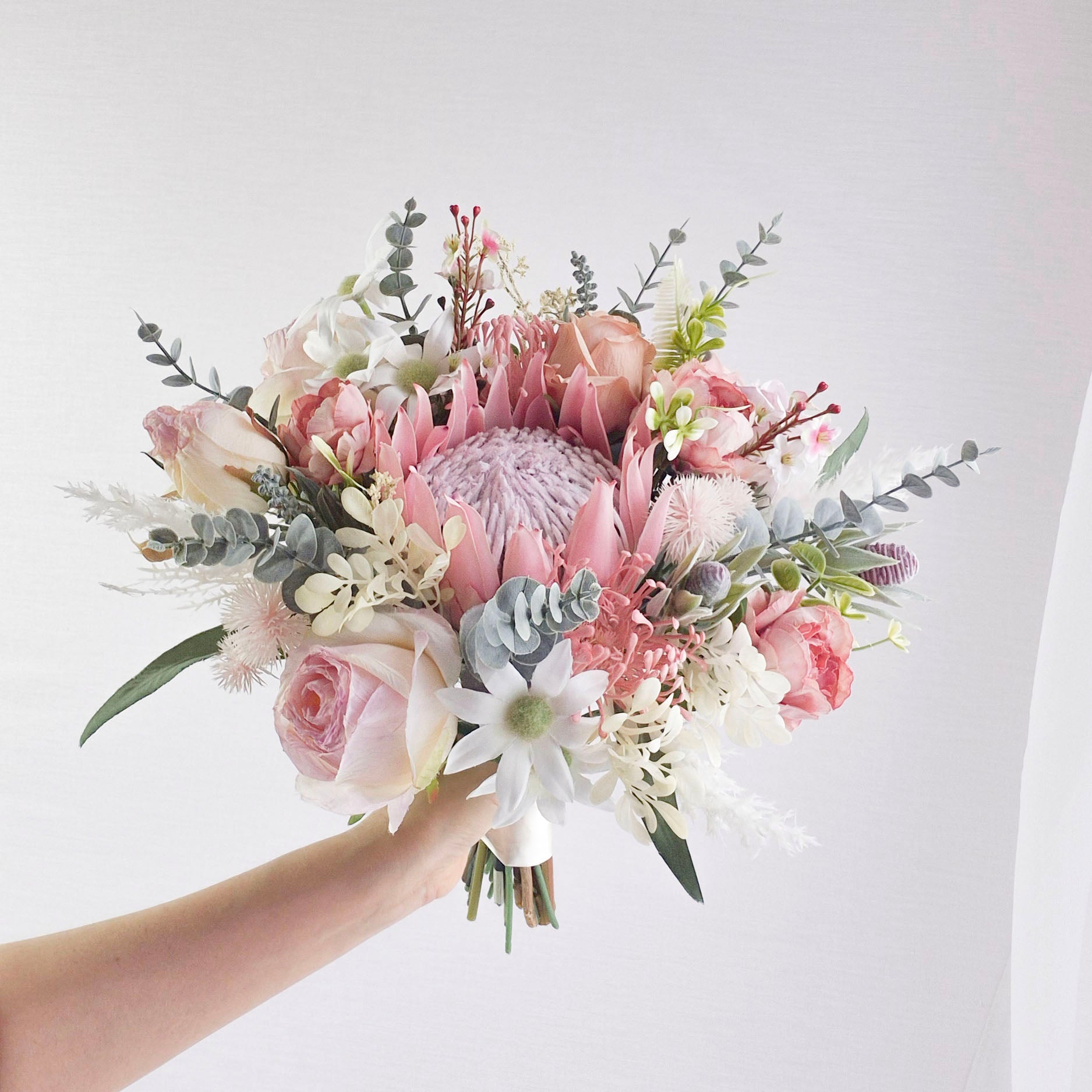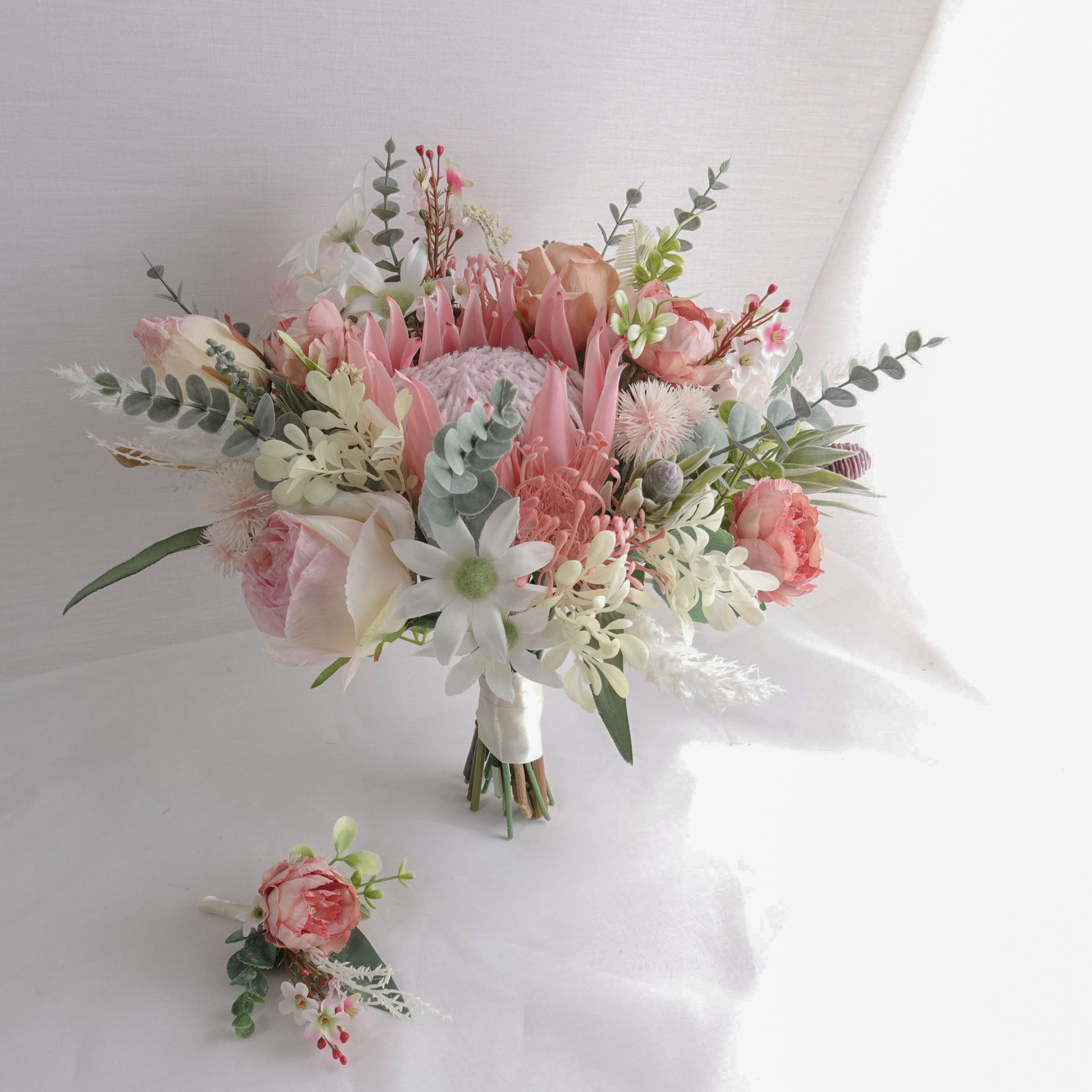 - Product & Type: Artificial Wedding Bouquet / Blush Pink King Protea Native Bouquet