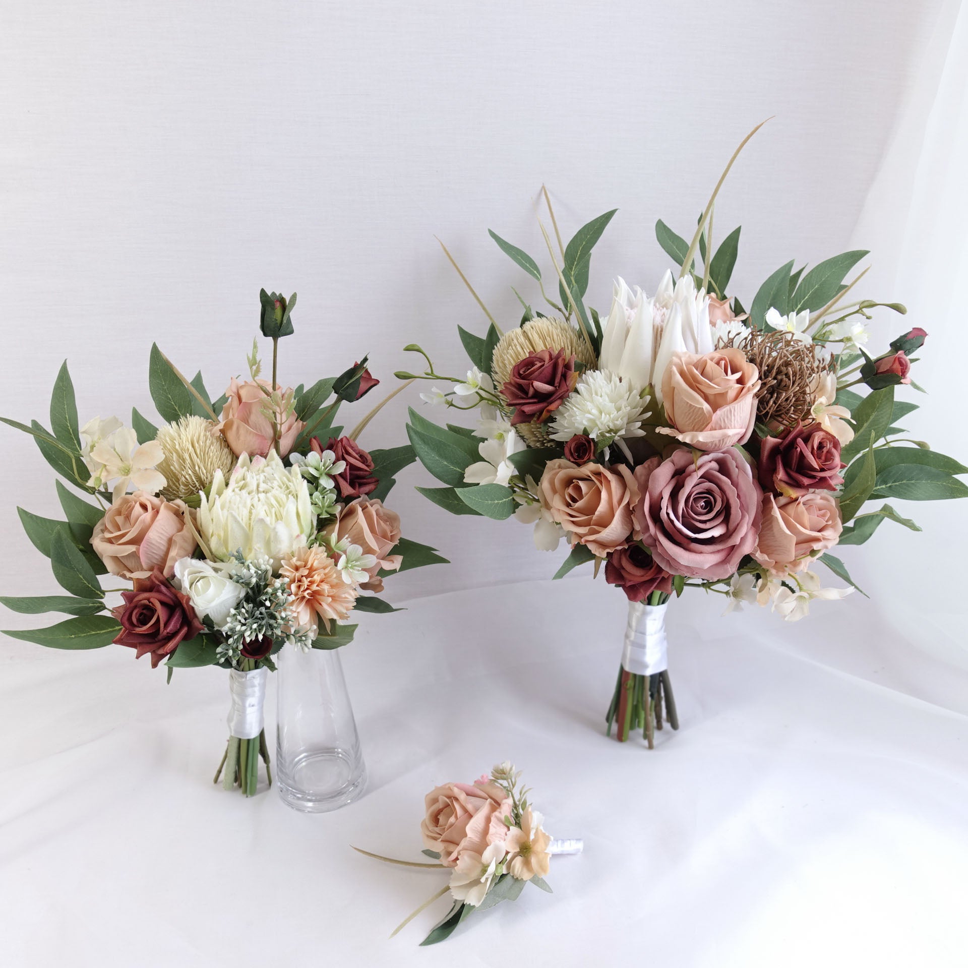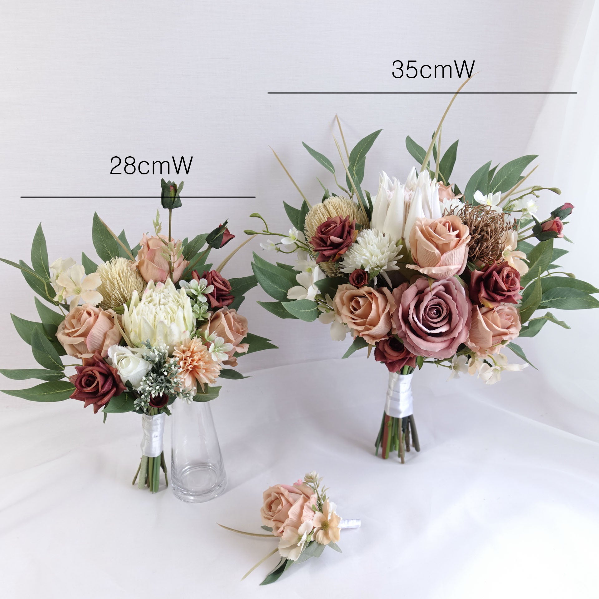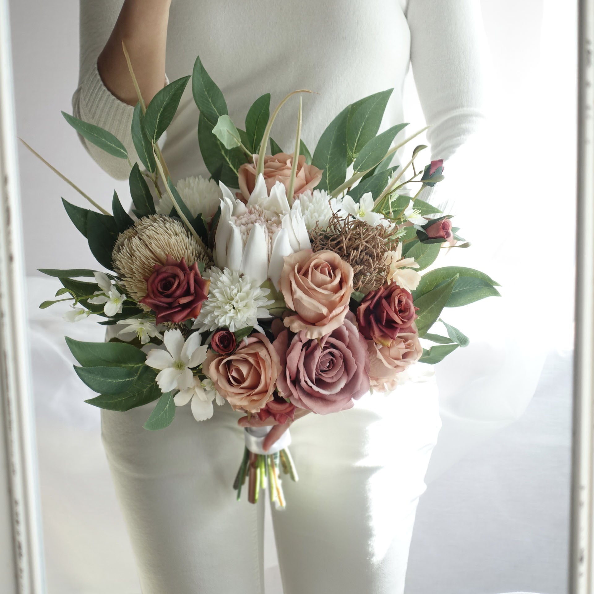 - Product & Type: Artificial Wedding Bouquet / Mauve Brown Cream Protea Rose Bouquet