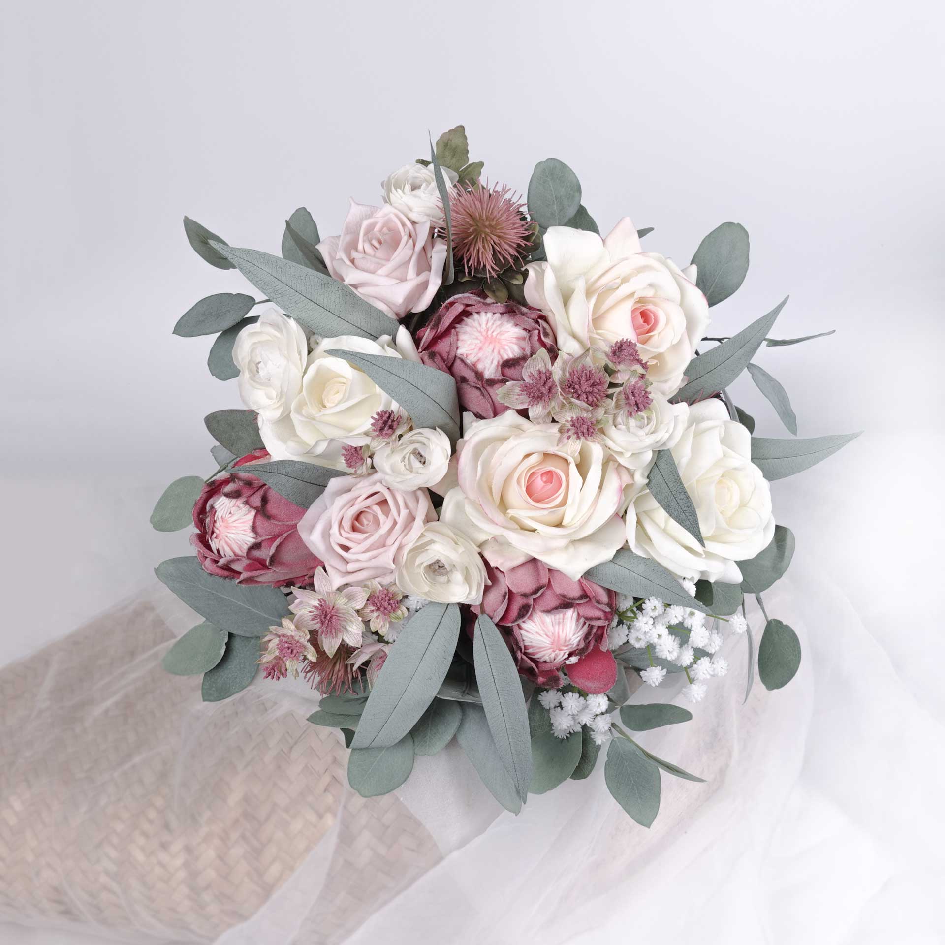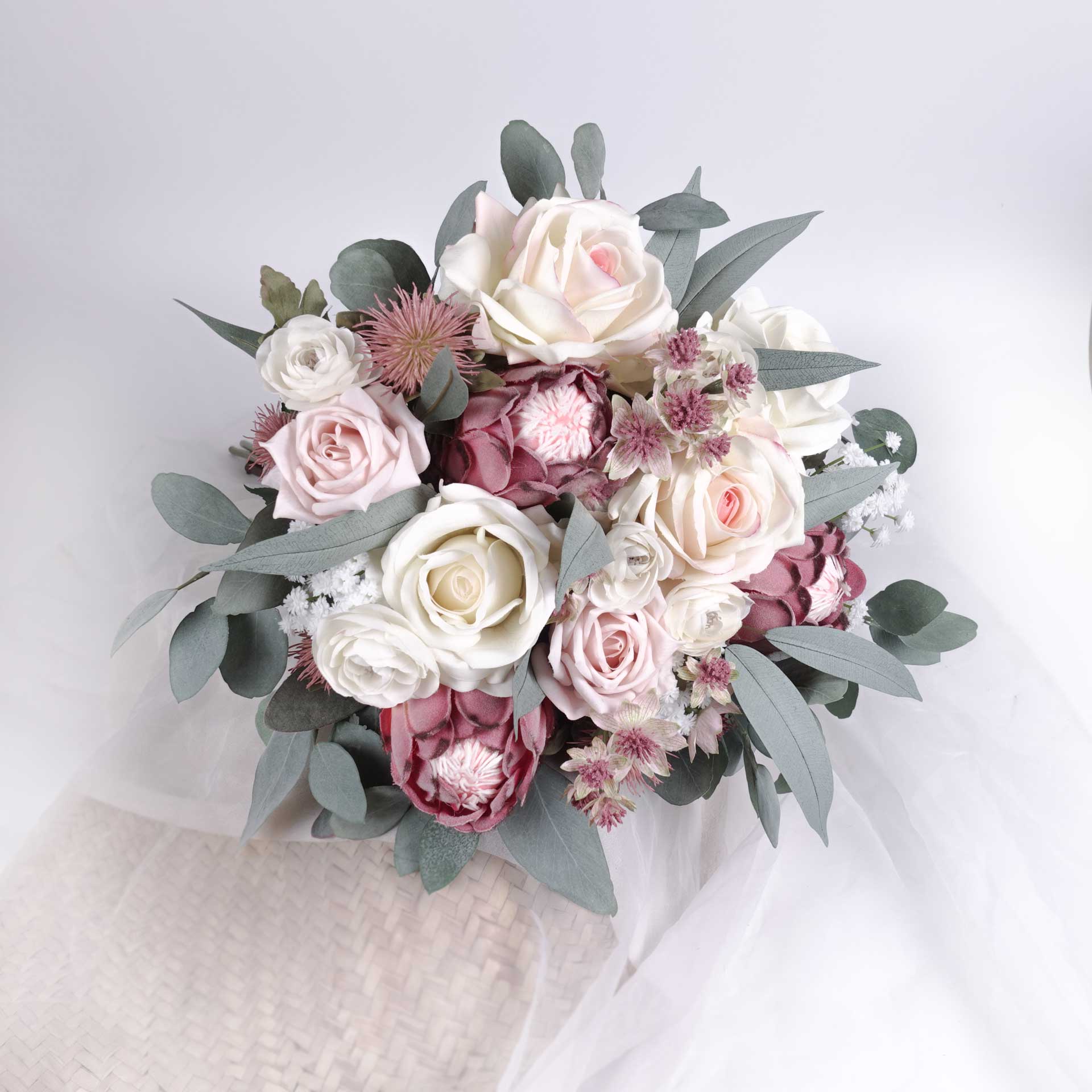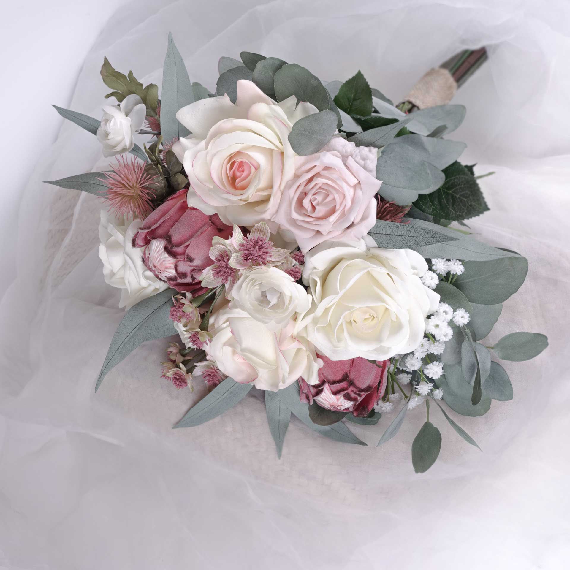 • The listing is for 1 x Protea Real-touch Rose Wedding Bouquet (supplied as a hand-tied bouquet). Styling items in photos NOT included.
