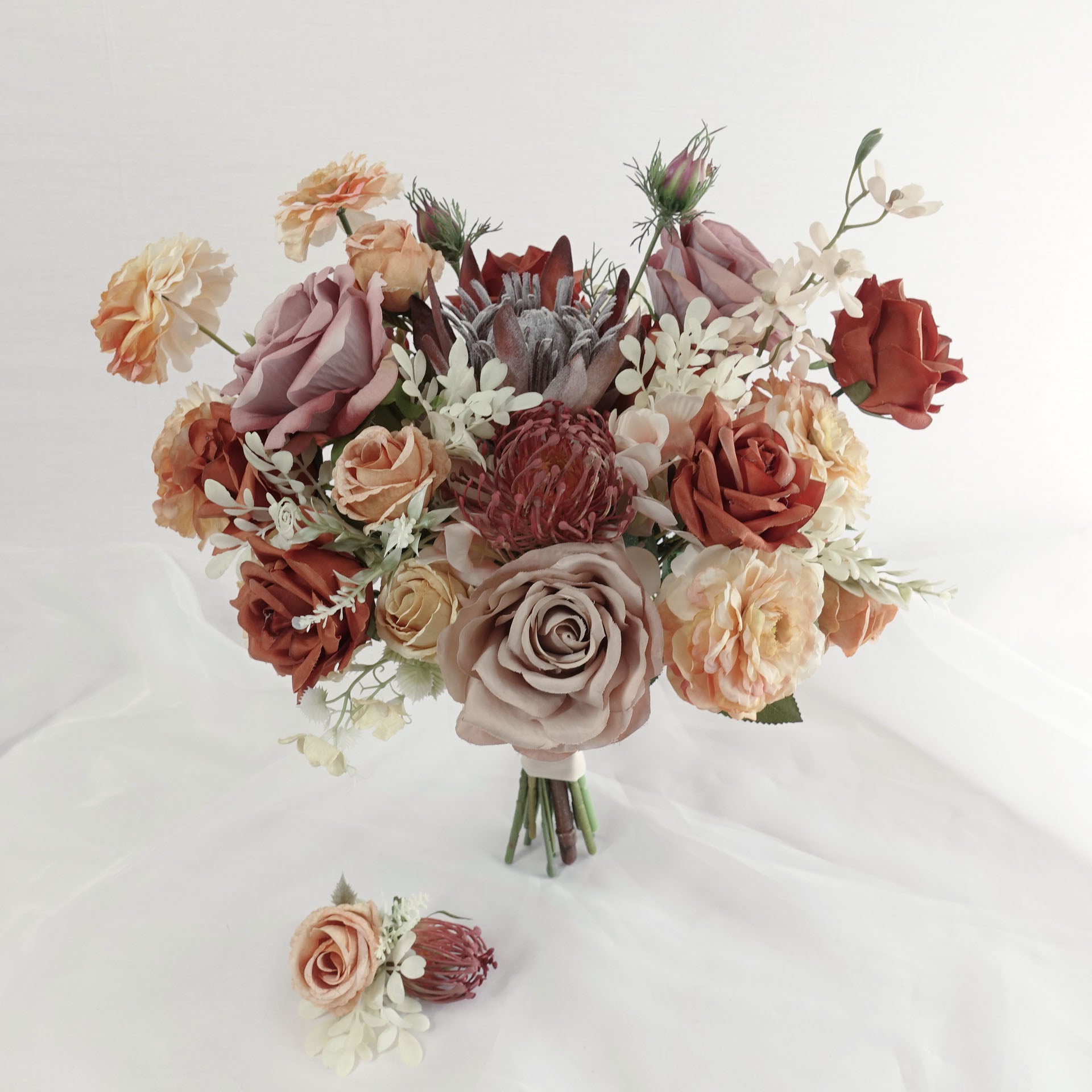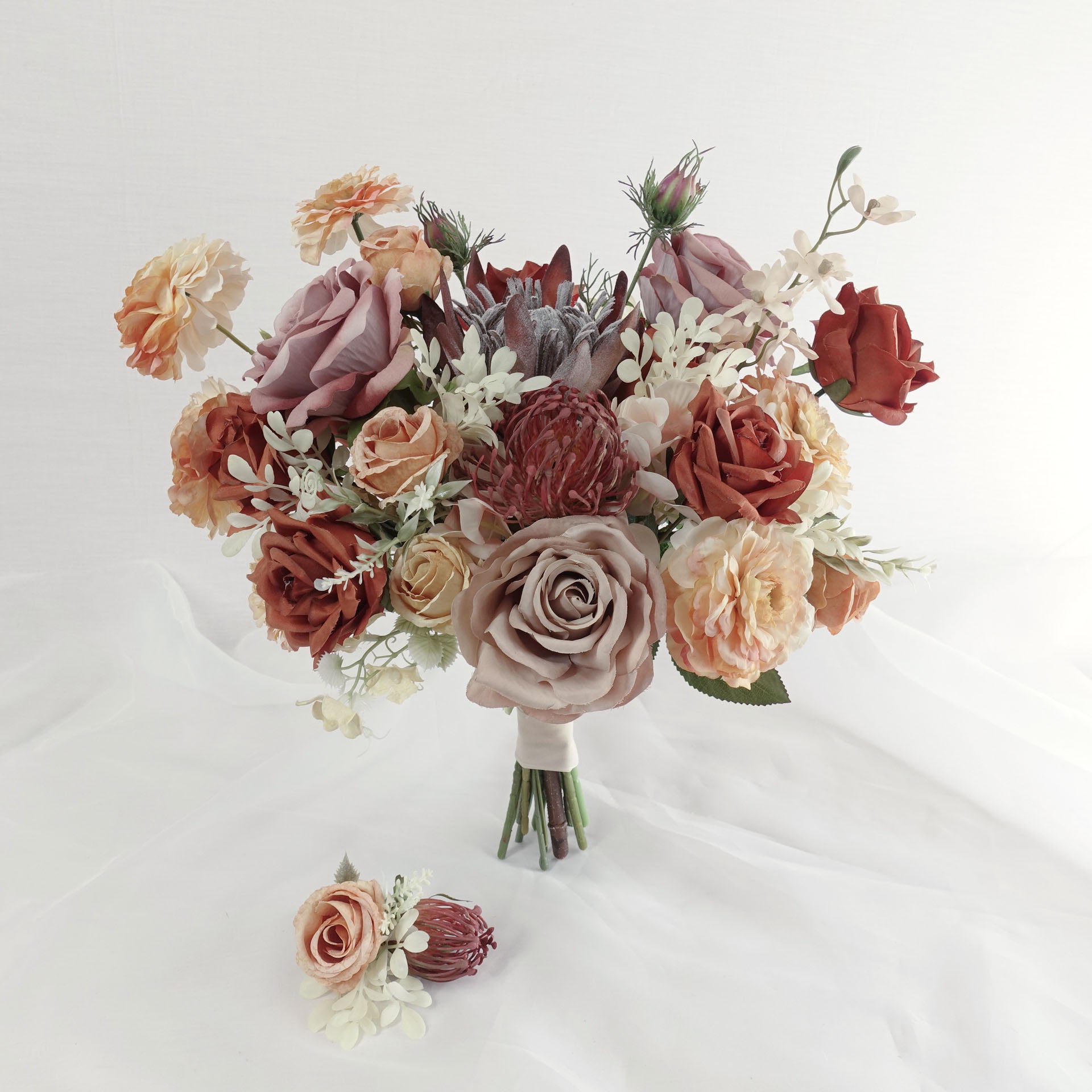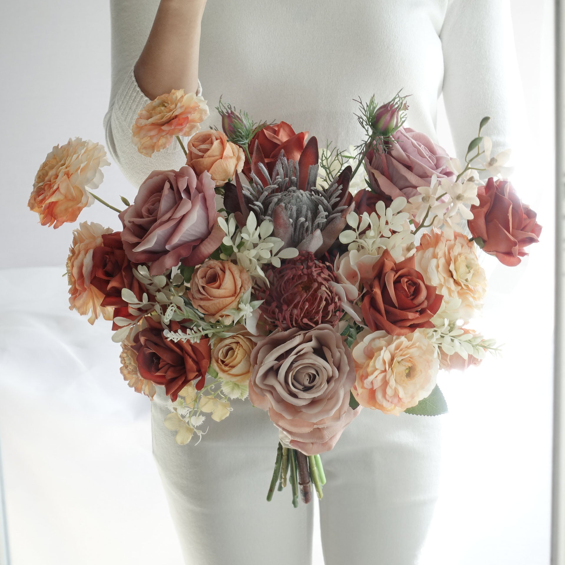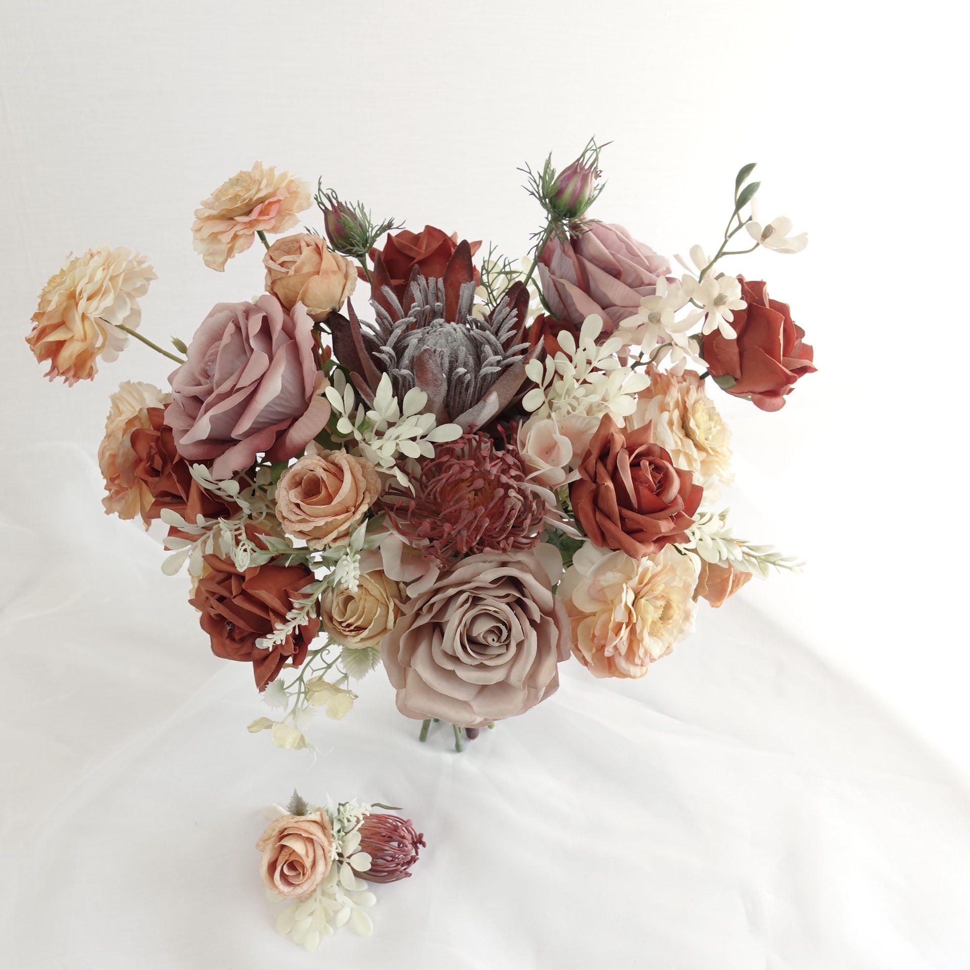 - Product & Type: Artificial Wedding Bouquet / Rust Mauve Dusty Peach Protea Rose Wedding Bouquet