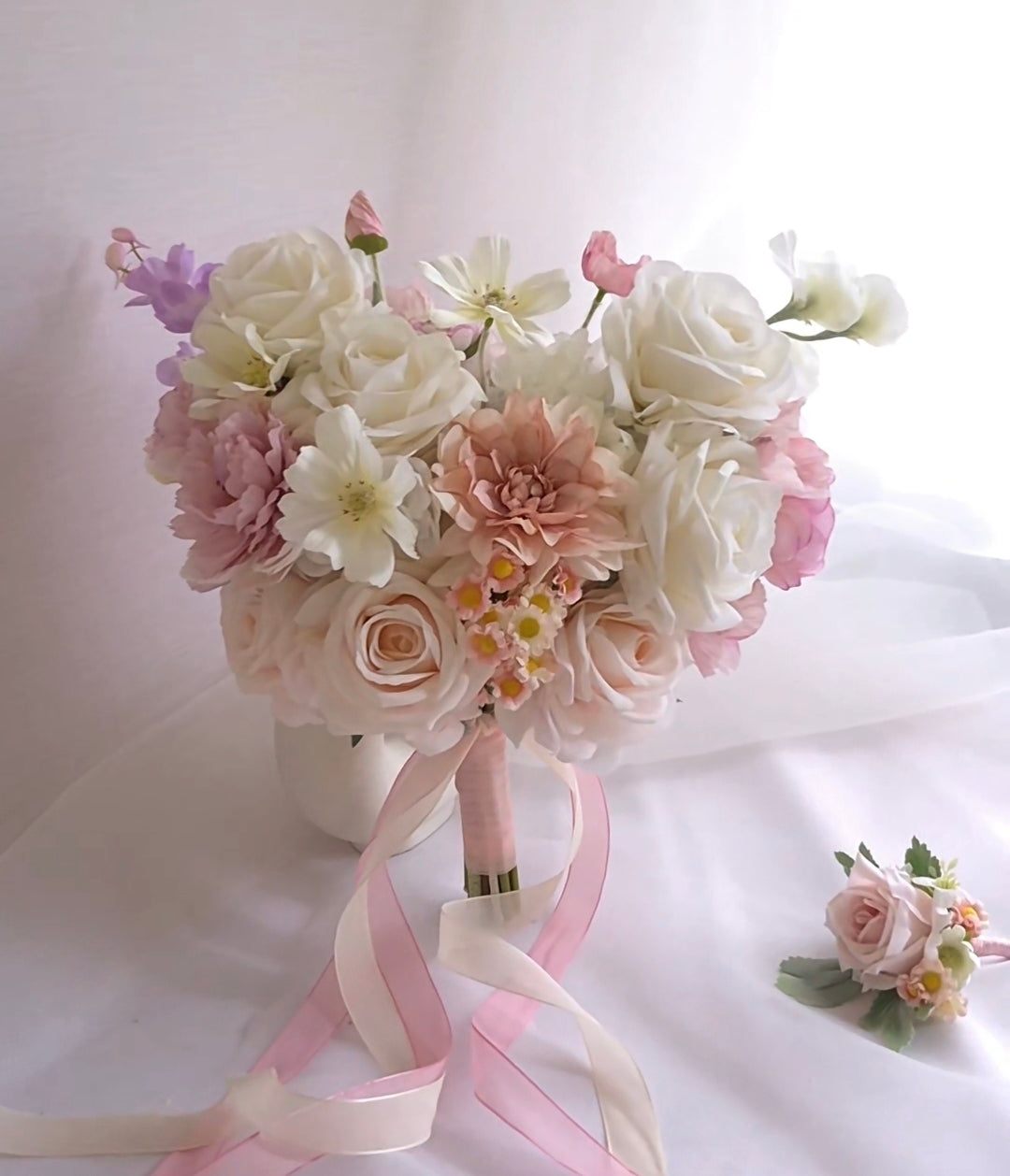 - Product & Type: Artificial Flower Bouquet / White Pastel Pink Rose Peony Dahlia Bouquet
