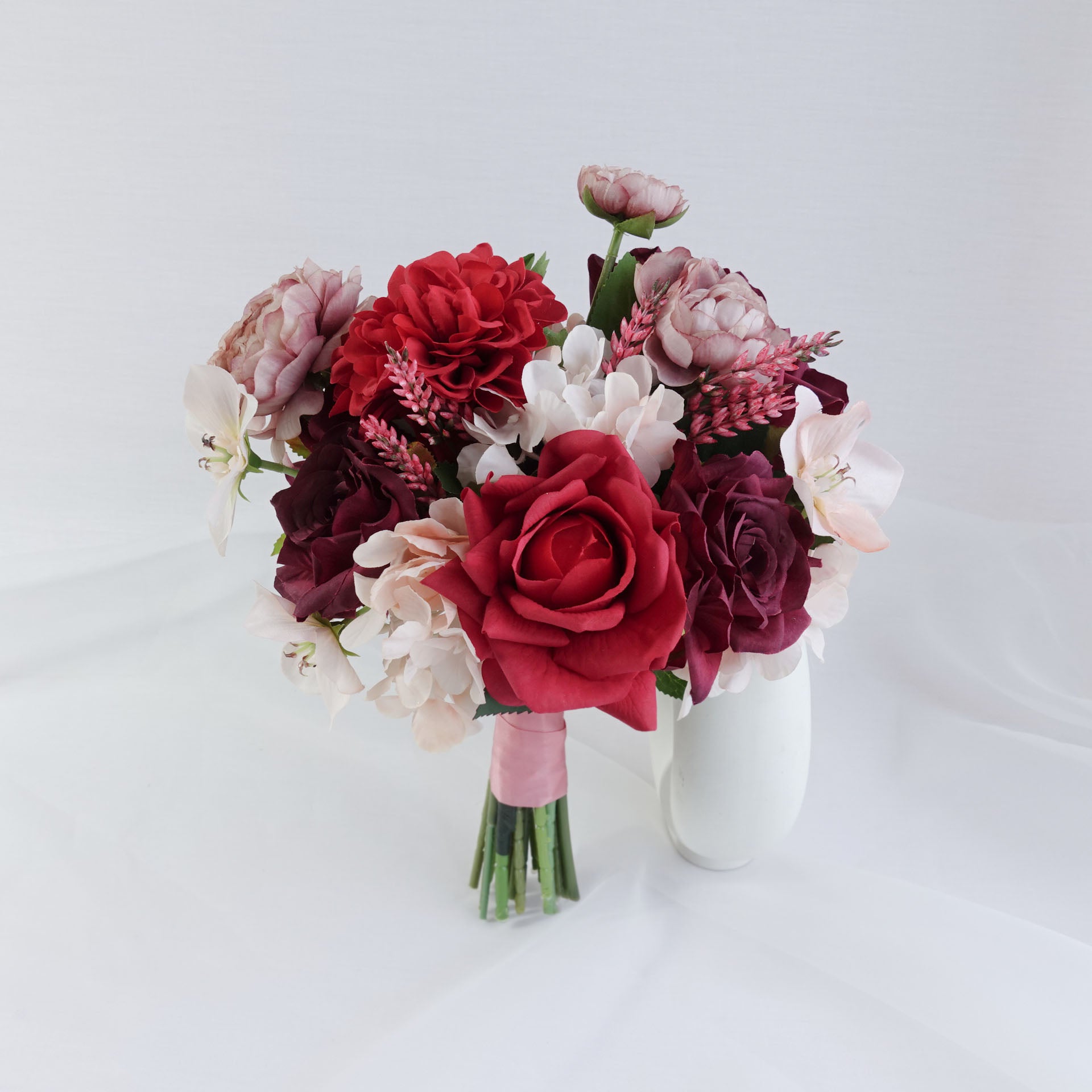 - Product & Type: Artificial Wedding Bouquet / Red Mauve Bridesmaid Bouquet