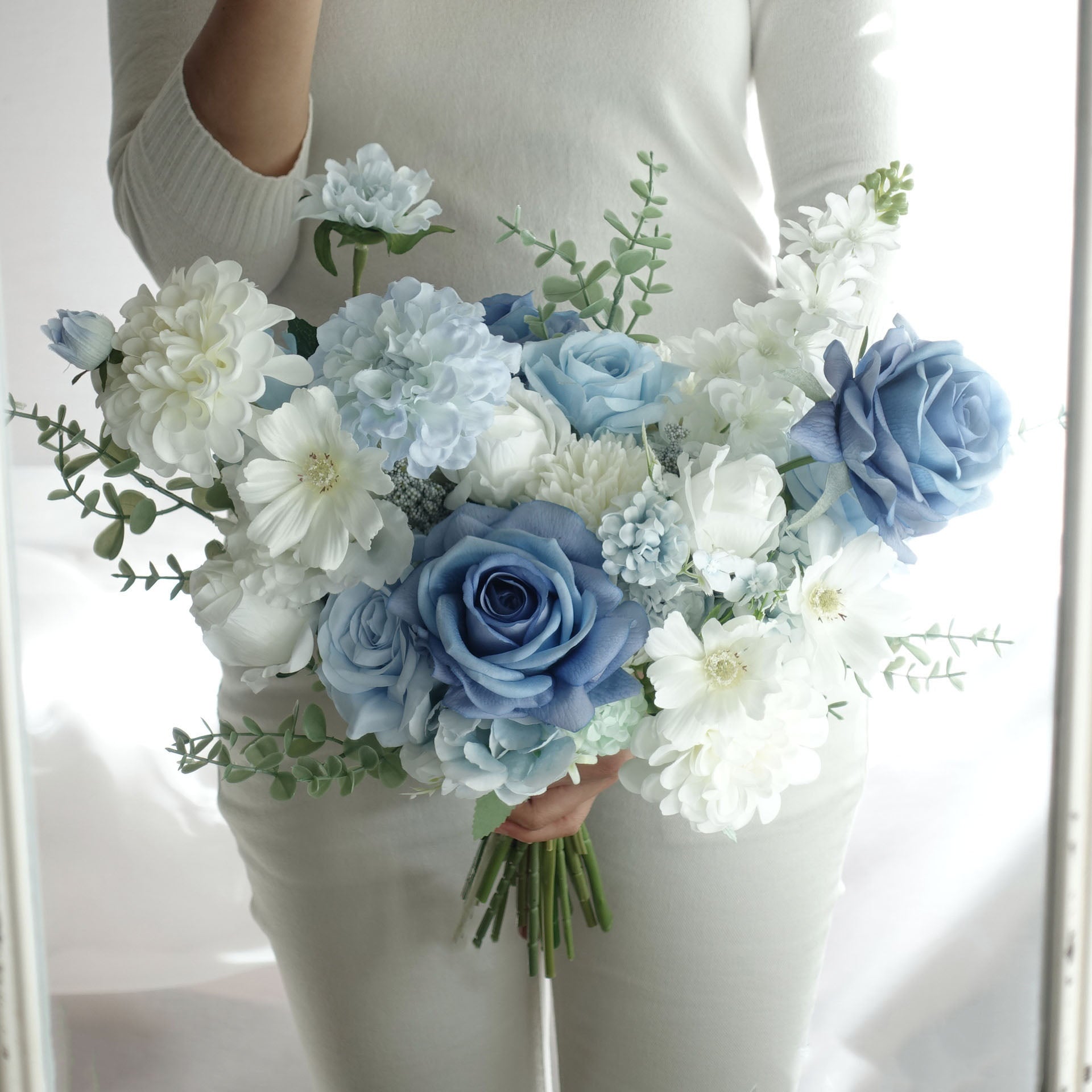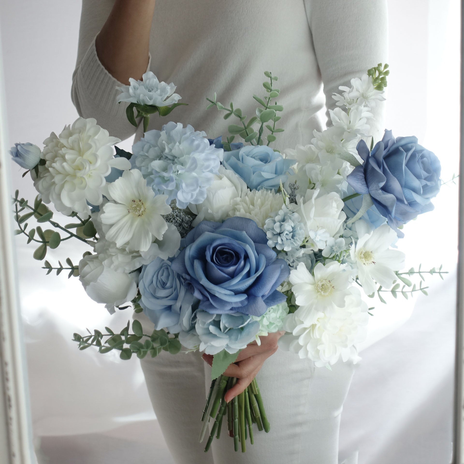 - Product & Type: Artificial Wedding Bouquet / White Blue Rose Dahlia Wedding Bouquet